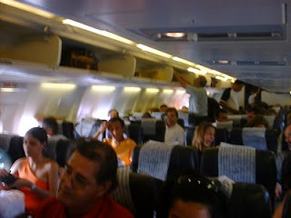 Al llegar, se presencia un acto semejante pero mucho mas agresivo. Sin haberse detenido el avión, comienzan a sonar los cinturones, a pesar del aviso de no quitarse los mismos. En lo que se siente que se detiene por vez primera la nave, y aun cuando ni siquiera se han apagado las turbinas, comienza a pararse la gente, y sin reparar en los demás, abren violentamente las puertas de los portaequipajes, y sacan el suyo, sin importar si le pegan al que esta abajo. Sacan las maletas, y por supuesto el espacio se hace cada vez menor, ya que el mismo lo ocupan cada vez mas elementos, y siendo el mismo espacio, se cumplen las leyes físicas que nos rigen a todos por igual. Finalmente, el capitán indica que esta autorizada la apertura de las puertas, con lo cual se desbocan a correr todos los parados en el pasillo, y a quienes les toco la mala suerte de estar lejos del mismo, les toca pedir, por lo general de mala manera, permiso, para poder salir corriendo, maleta en mano. Todos al entrar desean ventana, pero al salir desean pasillo.
