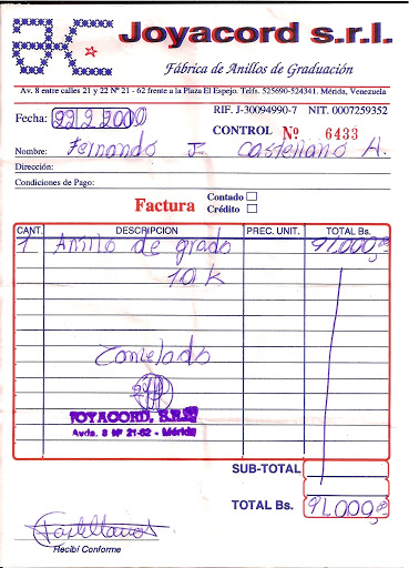 El precio del anillo fué de 91.000,00 bolívares de los de la época. Hoy en día no es ni siquiera lo que gasto en desayuno cuando voy con mi esposa e hija, pero en aquel entonces, era una gran suma de dinero. Tanto, que recuerdo que dimos un monto como anticipo, y quedamos pagando no recuerdo cuántas cuotas, al final de las cuales, tendría la joya en mis manos, lista para ser usada por el nuevo profesional en el cual me convertiría.