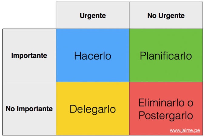 Una parte importante de la productividad es la Gestión de Prioridades. Hay distintos métodos que tratan éste tema, pero el que más me gusta es el de la matriz de Eisenhower. Así, se tiene una forma relativamente fácil (siempre que logres identificar donde cae cada actividad que tienes pendiente) para saber qué hacer o no.