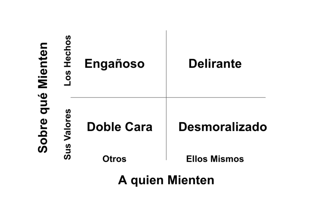 Para entender cómo las mentiras afectan la gestión y el liderazgo voy a usar un marco sencillo que encontré (no tengo la fuente) que es muy revelador al definir los tipos de mentiras que se dicen y a quién. De ahí surgen cuatro comportamientos que todos hemos visto… y que todos debemos evitar.